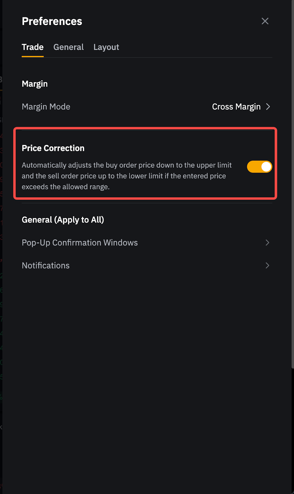 For Limit Order: If the order price of a buy (or sell) order is higher (or lower) than the price limit, the order will be canceled and will not be executed if you have disabled Price Correction settings (by default). If you have enabled the Price Correction settings, the order price of the buy (or sell) order will automatically be adjusted down (or up) to the upper (or lower) limit when the entered price exceeds the allowed range.