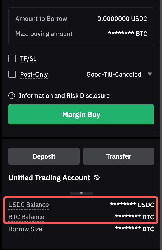 - Make a deposit or manually transfer assets in the respective borrowed amount from another account to your Unified Trading Account. The borrowed amount will be deducted from your positive wallet balance immediately.