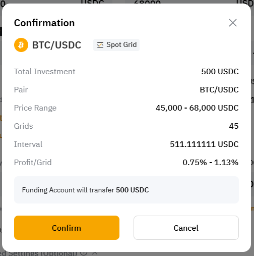 Step 4: Please double-check the grid bot information you’ve created, and then click on Confirm to start trading.