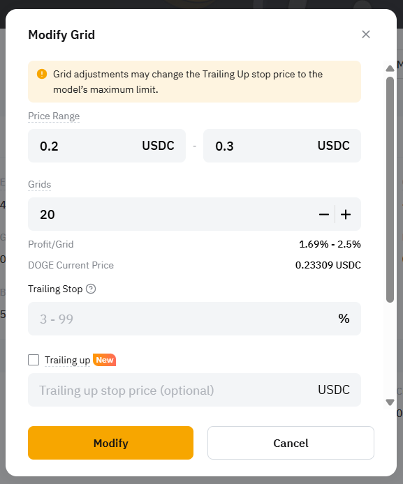 — The current modification parameters do not support independently changing Take Profit and Stop Loss settings. You must modify either the grid number or price range to adjust take-profit and stop-loss.