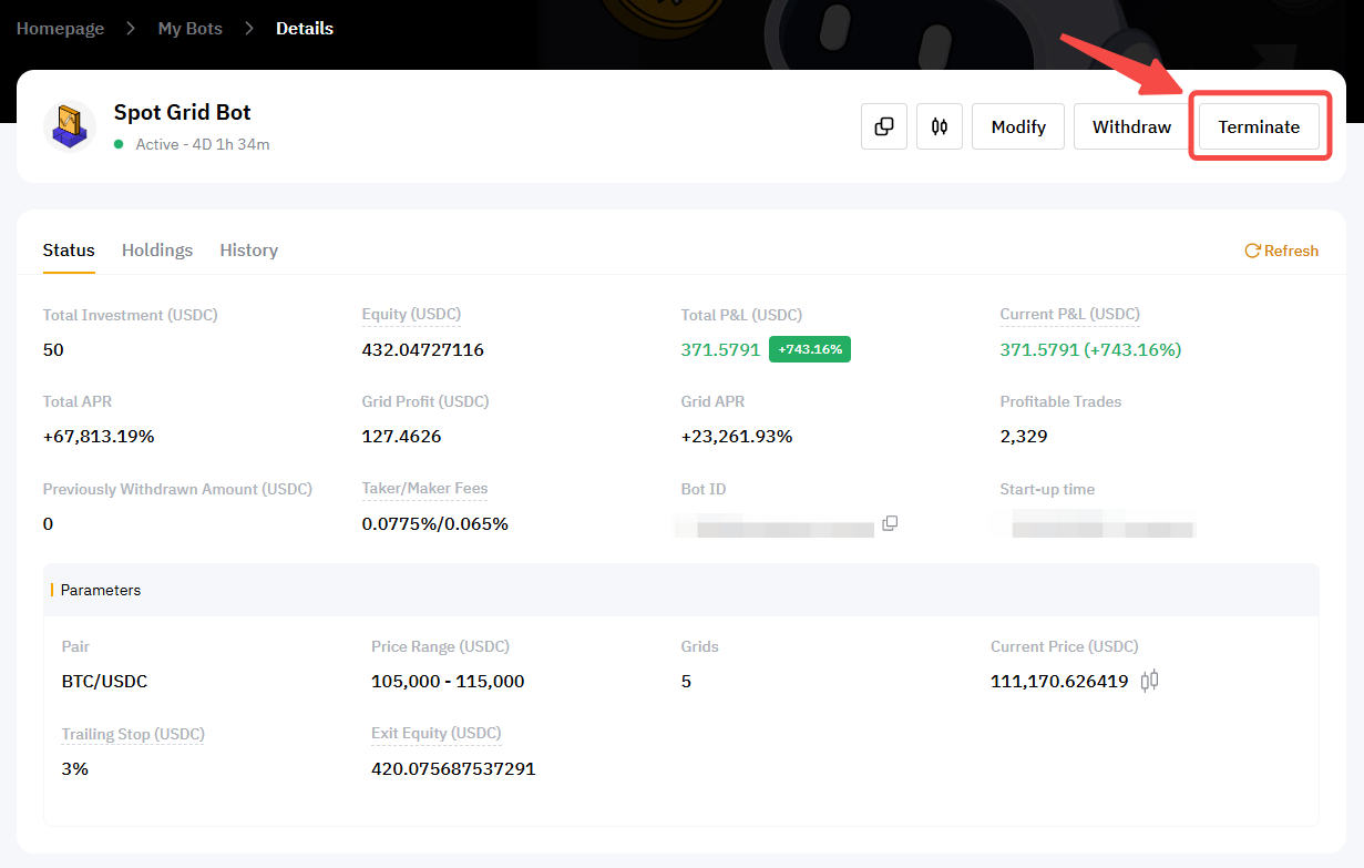 To terminate your Spot Grid Bot, go to the details page of your Spot Grid Bot and click on Terminate.