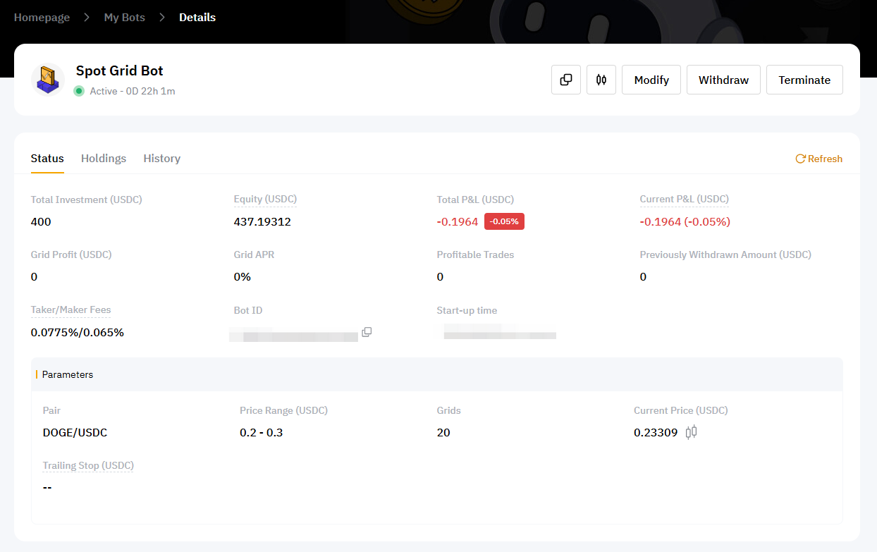 You can click on Details in the upper right corner of the grid bot you wish to view to explore more information, including the current status of your Spot Grid Bot, current orders under the Holdings tab, and your order history.