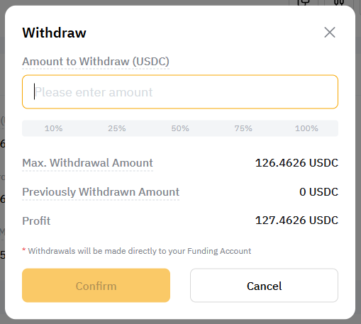 The maximum amount that can be withdrawn is your grid profit after the fee deduction. You can refer to the Max. Withdrawal Amount which is displayed on the withdrawal window. The withdrawn amount will be credited to your Funding Account.