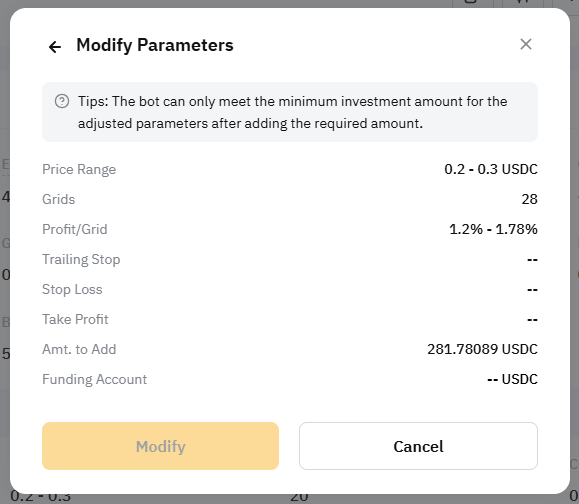 Step 2: Modify your Price Range, Grids, or TP/SL. Additional investment amounts or a modified buy or sell quantity of the base token may be required to meet the new parameters.