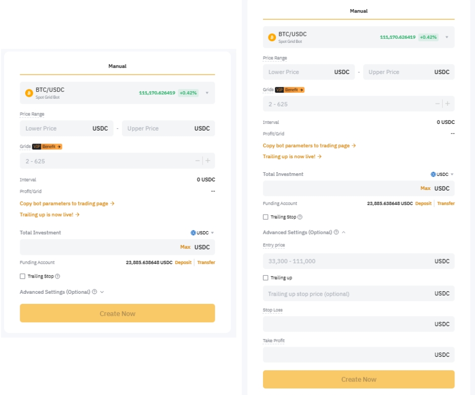 Take-Profit Price: When the market price of the coin reaches the Take-Profit price, the bot will be terminated and automatically sell the base token into USDC at the predetermined level to lock in your profits.