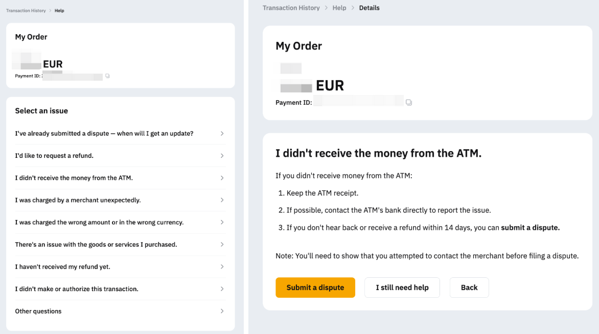 Follow the step-by-step guide below to submit a dispute — whether for an online or offline purchase or an ATM withdrawal.