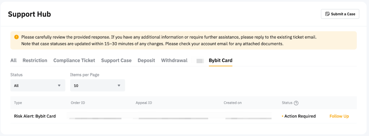 Bybit EU will make a final decision based on the information and evidence you provide. Once your request is approved or rejected, it will no longer appear in the Support Hub. You will receive an email notification with the status update.