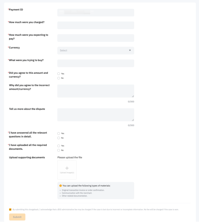 — You can only submit one dispute per transaction. Duplicate chargeback requests will not be accepted.