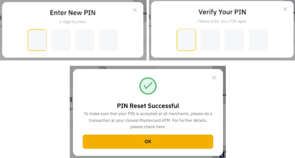 It is important to note that after resetting your PIN, you have to complete a transaction on an ATM first (a balance inquiry will do) with the newly changed PIN. Then, go to any retail merchant to complete a chip and PIN transaction with the new PIN. Subsequently, you can use Bybit Card for a contactless or new PIN.