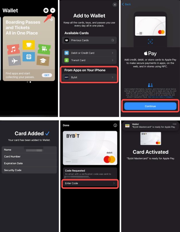 To add Bybit Card to Apple Pay, simply find Wallet/Watch on your iOS device and click on the add card button. Then, follow the instructions to add your Bybit Card details and complete the security verification.