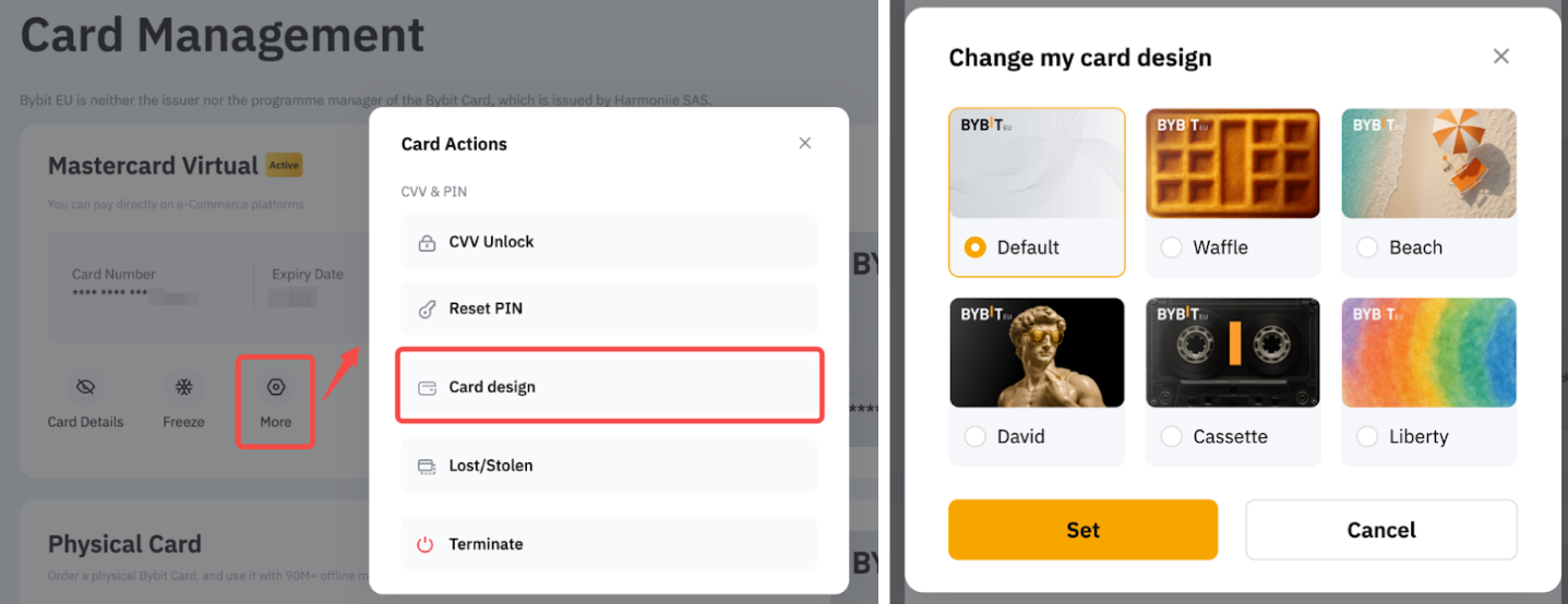 Please head to the Card Management page, click on More and select Card Design. You will be directed to a gallery of available virtual card designs. Browse through the selection, select your preferred design and click on Set.