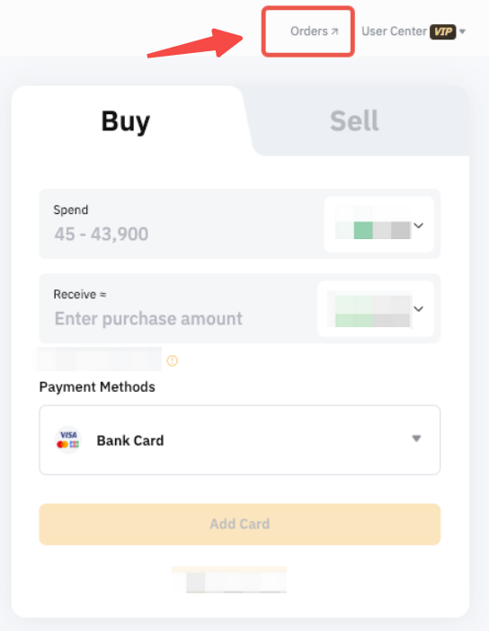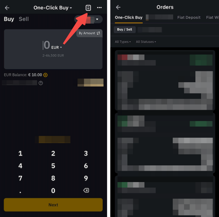 Auf der App, gehen Sie bitte zu Homepage → tippen Sie auf Mehr → Krypto Kaufen→ Klicken Sie auf das Papiersymbol in der oberen rechten Ecke.