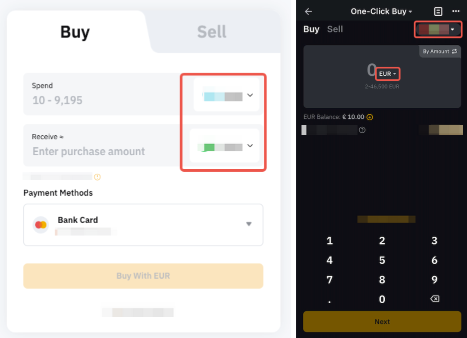 Sie finden die Liste der unterstützten Währungen und Münzen für verschiedene Zahlungsmethoden, indem Sie auf die Ein-Klick-Kaufseite und wählen Sie die Währung und Münze in den jeweiligen Menüs aus. Die verfügbaren Optionen werden als Zahlungsmethode angezeigt, wenn Ihr Kauf unterstützt werden kann.