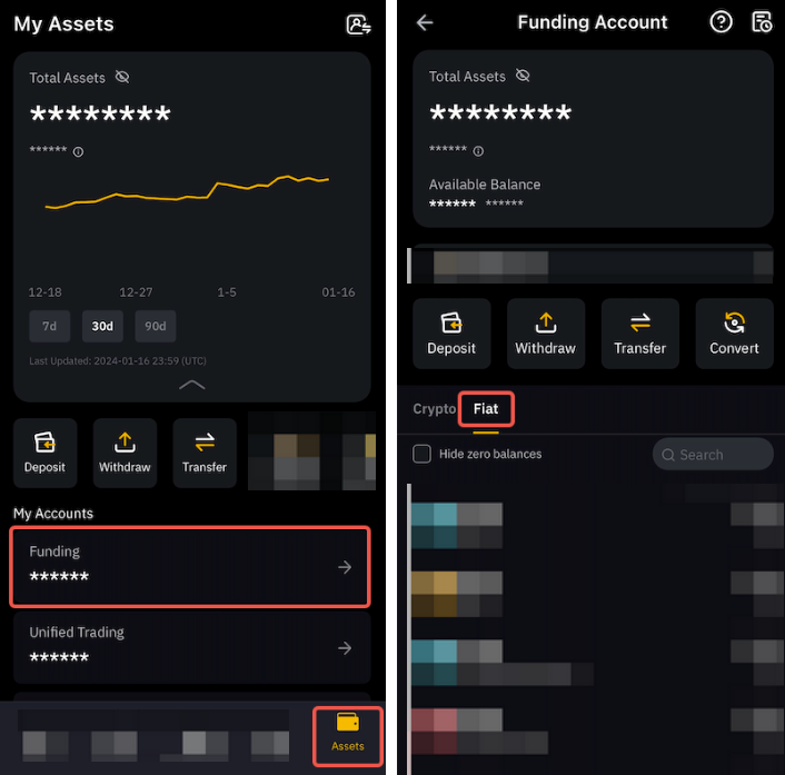 Tippen Sie in der App auf Assets → Finanzierung → Fiat.