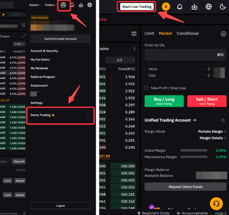 Auf der Bybit EU-App findest du den Eingang zu Demo-Trading durch Klicken auf Mehr → Demo-Trading. Wenn du dich auf der Demo Trading-Seite befindest, kannst du oben rechts auf der Handelsseite auf Live Trading starten klicken, um wieder zum Live Trading zurückzukehren.