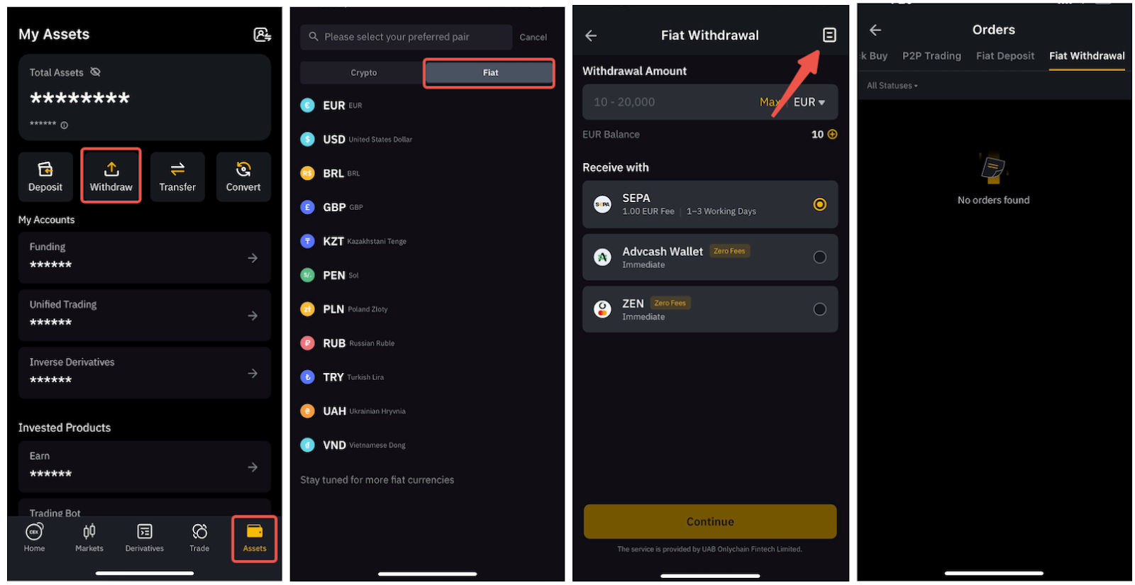 Ga op de App naar het tabblad Assets en tik op Opnemen, schakel vervolgens over naar Fiat → selecteer een van de fiat → tik op het pagina pictogram.