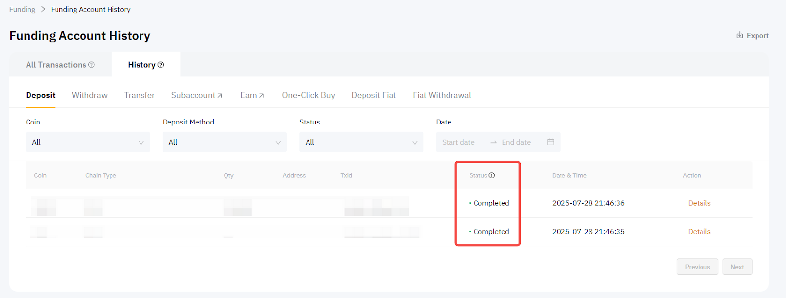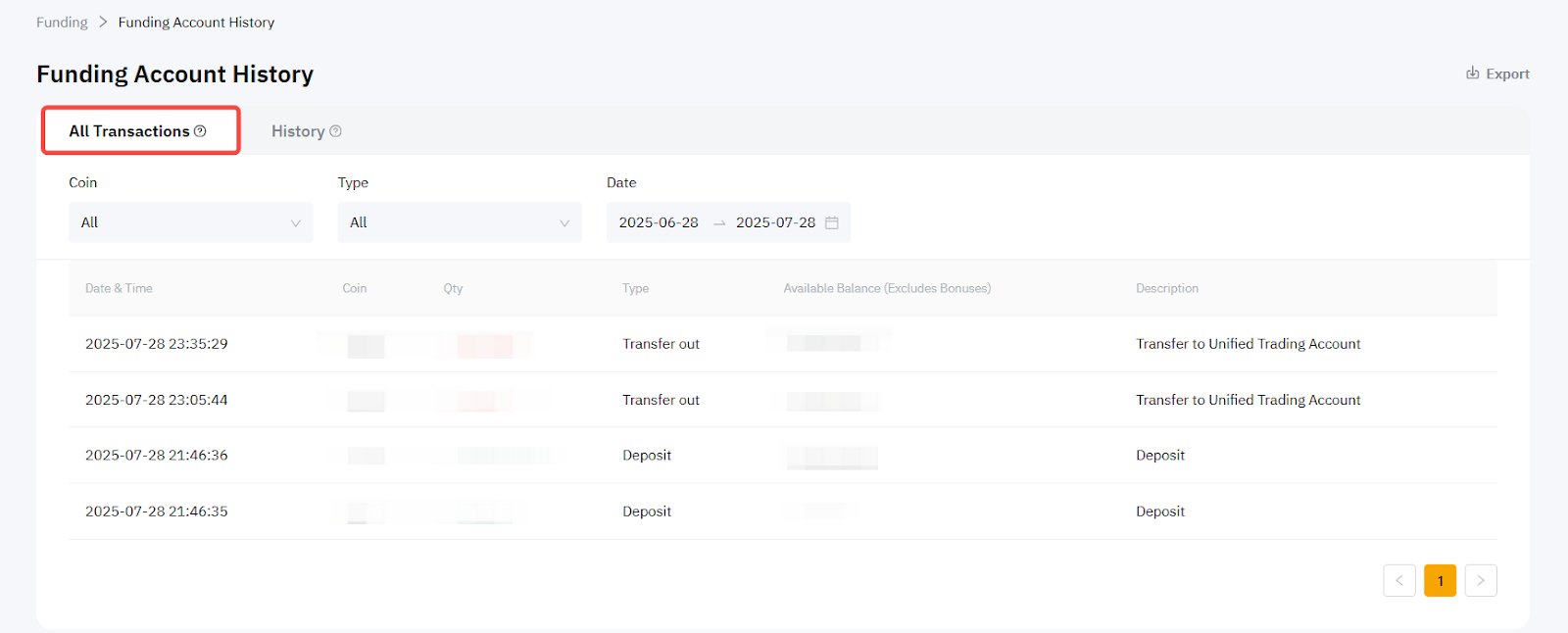 Standardmäßig werden Sie weitergeleitet zu Alle Transaktionen Registerkarte, auf der Sie alle vergangenen Transaktionen sehen können, die sich auf den verfügbaren Saldo Ihres Finanzkonto ausgewirkt haben. Zu solchen Transaktionen gehören frühere Aufzeichnungen von Krypto-/Fiat-Einzahlungen und -Abhebungen, Überweisungen zwischen Konten (UTA, Earn), Erträge aus Ihren aktiven Investitionen, Konvertierungen usw.