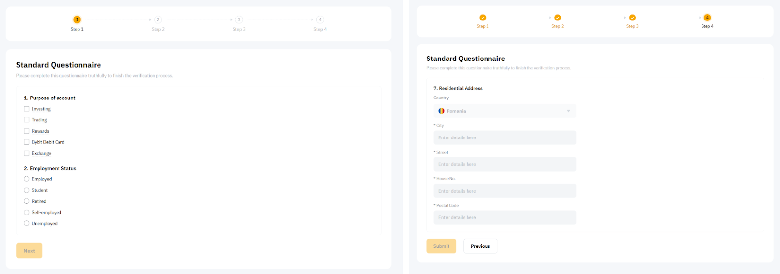 Der Standardfragebogen besteht aus 4 Seiten und soll dazu dienen, den Zweck und die Art unserer Geschäftsbeziehung zu verstehen, um sicherzustellen, dass wir die am besten geeigneten Produkte, Dienstleistungen oder Transaktionen anbieten. Im letzten Schritt müssen Sie Ihre Wohnadresse angeben. Bitte geben Sie ehrliche und genaue Antworten basierend auf Ihrer tatsächlichen Situation.