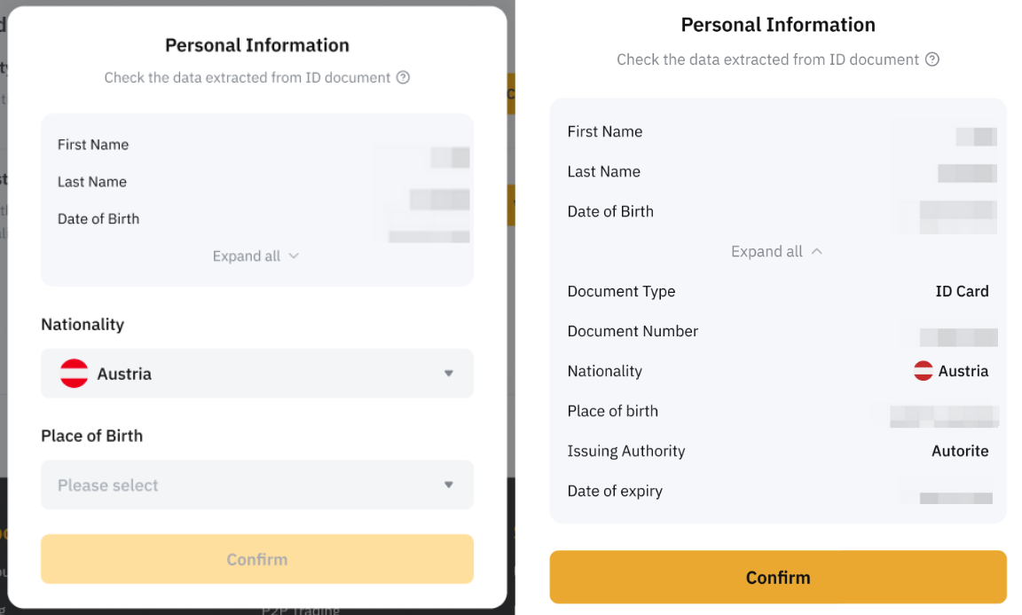 Sobald Sie den Verifizierungsprozess abgeschlossen haben, klicken Sie bitte auf Bestätigen um Ihre persönlichen Daten zu überprüfen und festzustellen, ob zusätzliche Informationen erforderlich sind.