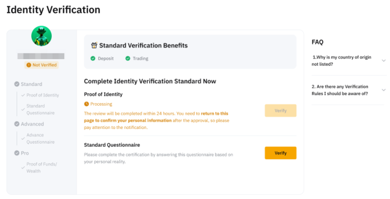 Glückwunsch! Ihre standardmäßige Identitätsverifizierung wurde abgeschlossen. Sie sind jetzt berechtigt, auf die unterstützten Produkte und Dienste zuzugreifen. Um Anspruch auf höhere Fiat-Einzahlungs- und Auszahlungslimits zu haben, können Sie mit der erweiterten Verifizierung fortfahren.