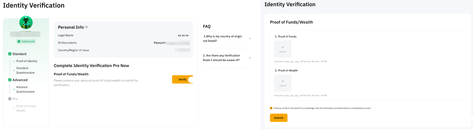 Um den Pro-Verifizierungsstatus zu erhalten, geben Sie die Quellen Ihrer Gelder oder Vermögensnachweise an, damit unser Team diese überprüfen und die Produkte und Vorteile des Pro-Benutzerstatus in Ihrem Konto freischalten kann. Der Überprüfungsprozess sollte innerhalb von 72 Stunden abgeschlossen sein.