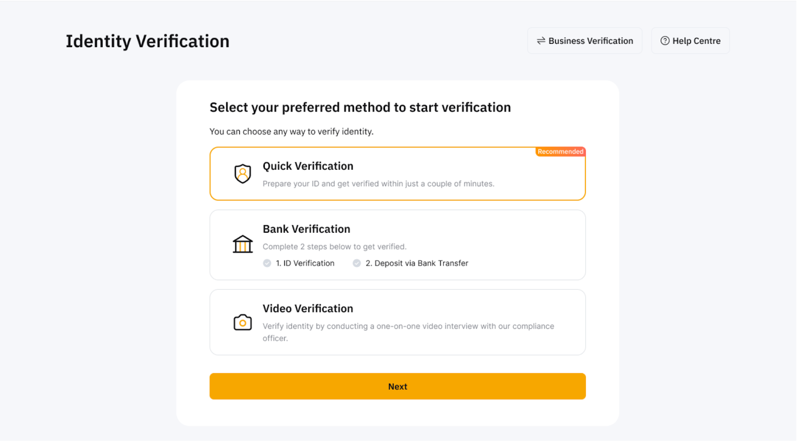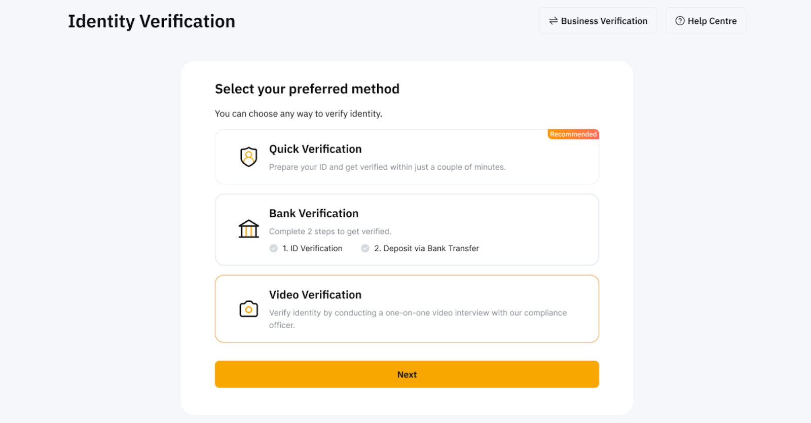 Schritt 2: Du siehst drei (3) Verifizierungsmethoden zur Durchführung deiner Identitätsverifizierung: Schnellverifizierung, Bankverifizierung und Videoverifizierung. Du kannst eine beliebige Methode auswählen, um deinen Identitätsnachweis einzureichen, und auf Weiter klicken, um fortzufahren.