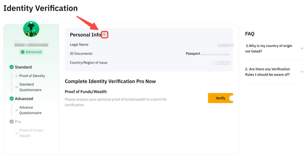 Um die Informationen zu überprüfen, die Sie während der Identitätsverifizierung übermittelt haben, klicken Sie auf das Augensymbol. Bitte beachten Sie, dass Sie Ihren Google Authenticator -Code eingeben müssen, um auf diese Informationen zuzugreifen.