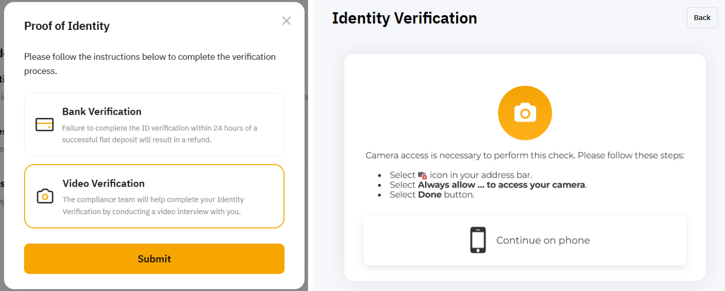 Der Identitätsnachweis umfasst zwei Arten von Verifizierungsmethoden: Bank und Videoverifizierung. Um Ihren Identitätsnachweis zu verifizieren, müssen Sie einen der folgenden Verifizierungsprozesse abschließen: