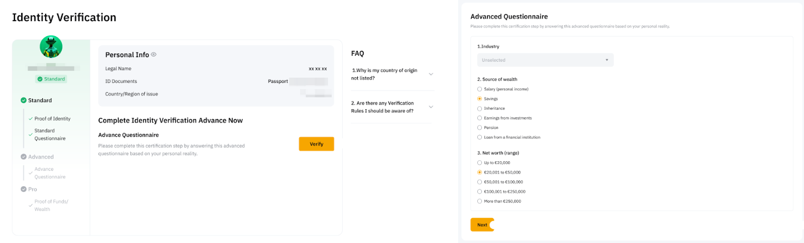 Füllen Sie nach dem Absenden Ihres Adressnachweises einen kurzen Fragebogen aus, indem Sie Ihre Vermögensquelle und Ihr Nettovermögen (Bereich) angeben. Sobald Ihre Antworten überprüft wurden, wird Ihr Kontostatus auf „Erweitert Identitätsverifizierung“ aktualisiert.
