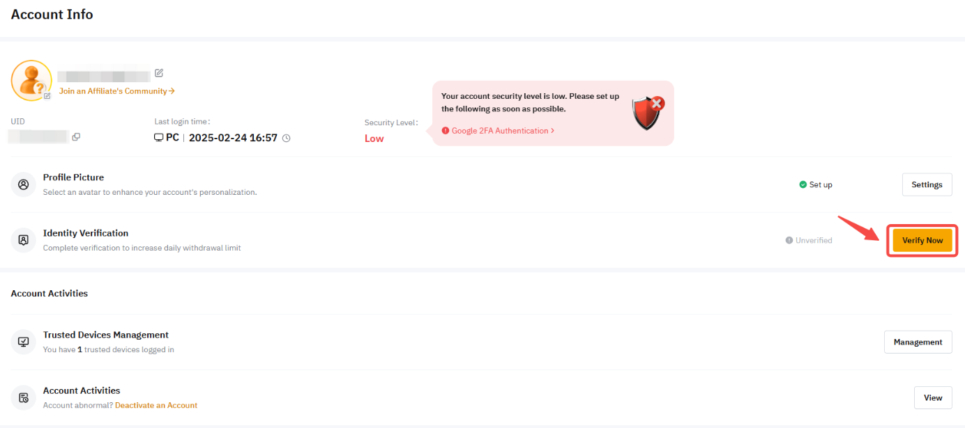 Schritt 2: Klicken Sie auf Jetzt verifizieren im Identitätsverifizierung Spalte unter Kontoinformationen zum Betreten des Identitätsverifizierung Seite.