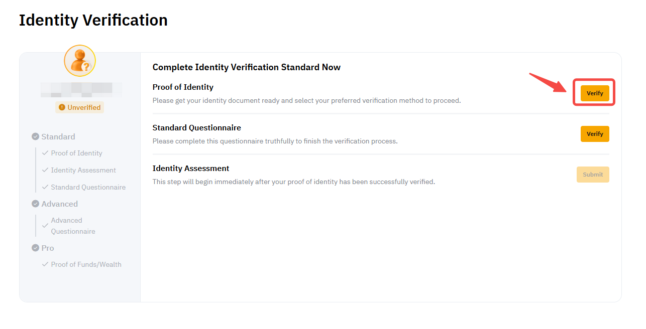Schritt 3: Zur Identitätsverifizierung werden Ihnen drei Abschnitte angezeigt: Standard, Erweitert, Und Pro. Einige Überprüfungselemente sind voneinander abhängig. Sie müssen die Überprüfungselemente mit einem verfügbaren Verifizieren Schaltfläche, bevor Sie mit dem nächsten fortfahren.