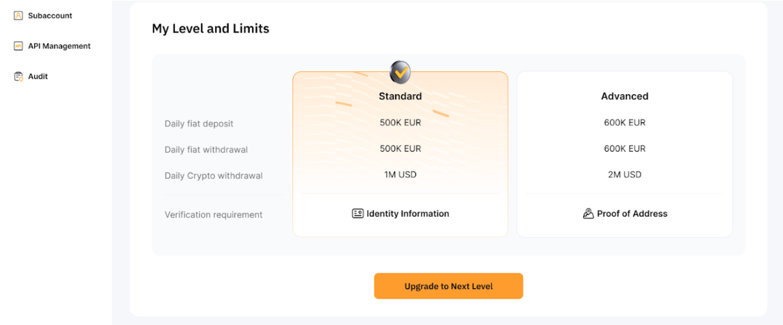 Bybit EU erfüllt die regulatorischen Anforderungen im Europäischen Wirtschaftsraum (EWR) und bietet dir eine sichere und zugängliche Plattform für den Handel mit Kryptowährungen. Um die Produkte und Services von Bybit EU nutzen zu können, musst du als Nutzer im EWR die Standardverifizierung abschließen. Die Erweiterte Verifizierung ist optional, ermöglicht dir aber höhere Limits für Fiat-Einzahlungen. Die Anforderungen für die Standard- und die Erweiterte Verifizierung sind wie folgt: