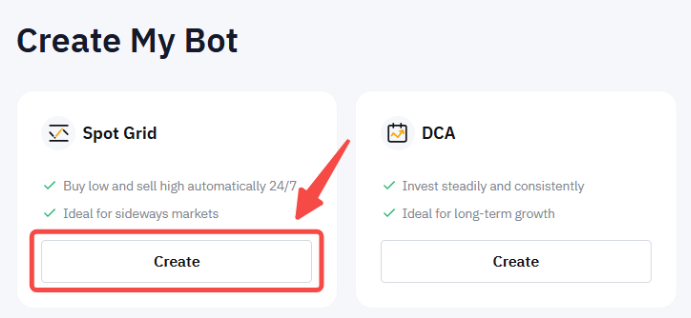 Schritt 2: Erstellen Sie Ihren Spot Grid Bot, indem Sie auf Erstellen klicken, um zur Seite „Spot Grid Bot erstellen“ zu gelangen.