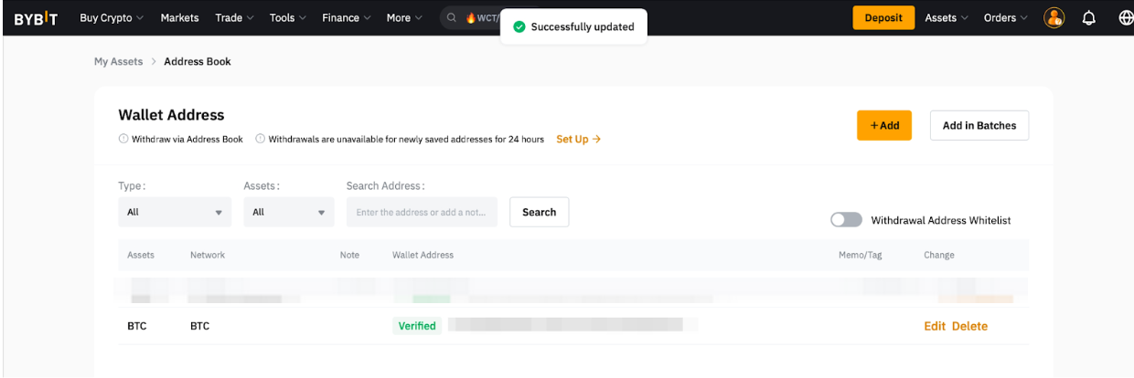 Hinweis: Um mehr darüber zu erfahren, wie Sie eine Wallet-Adresse bei Bybit EU hinzufügen, folgen Sie bitte der Anleitung Hier.
