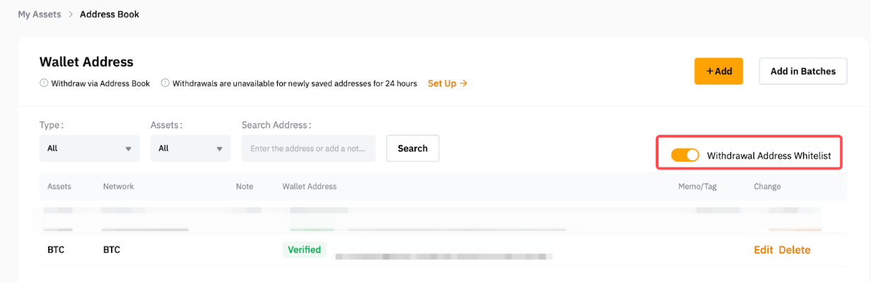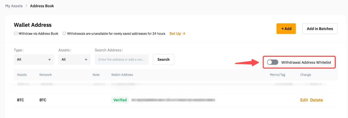 Schritt 5: Sobald die Überprüfung der Wallet-Adresse abgeschlossen ist, aktivieren Sie bitte die Whitelist für Auszahlungsadresse Funktion in der oberen rechten Ecke der Seite, um die verifizierte Wallet-Adresse in Ihrer Auszahlungsfunktion auf die Whitelist zu setzen.