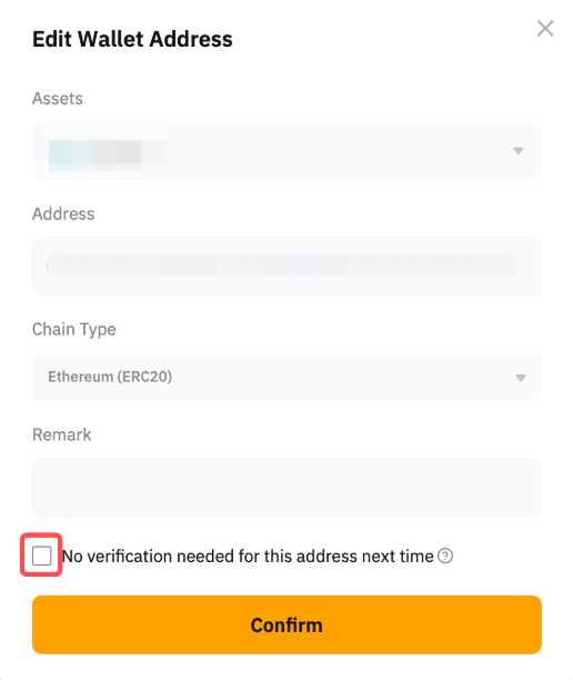 Schritt 3: Geben Sie die korrekten Coin-, Blockchain- und Wallet-Adressinformationen für Ihr Auszahlungs-Wallet ein und aktivieren Sie das Kontrollkästchen Für diese Adresse ist beim nächsten Mal keine Überprüfung erforderlich Option. Klicken Sie auf Bestätigen sobald Sie fertig sind.