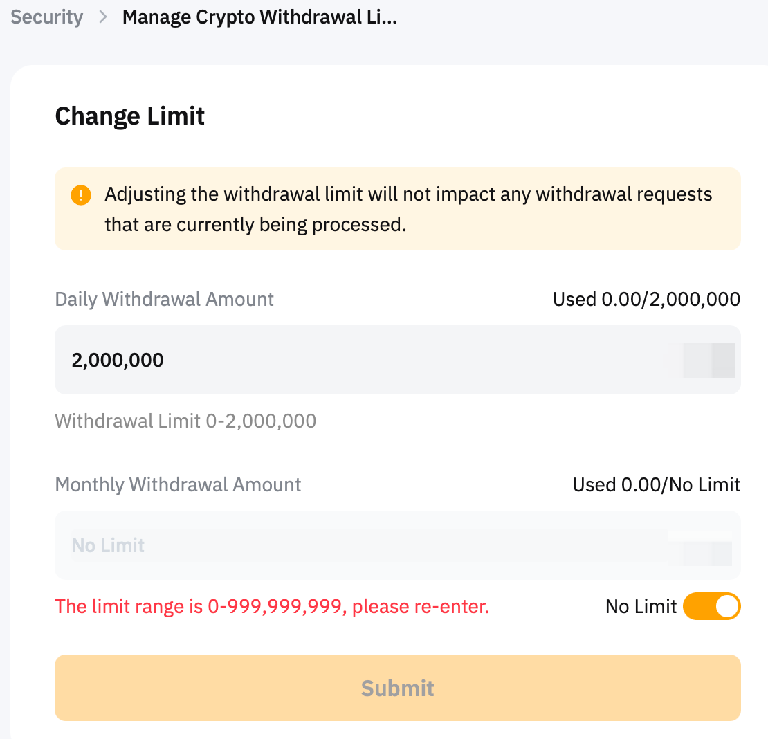 Um Ihre Abhebungen besser kontrollieren zu können, können Sie auch Ihre eigenen täglichen und monatlichen Krypto-Abhebungslimits festlegen. Geben Sie einfach den Auszahlungsbetrag für jedes Limit ein und klicken Sie auf Einreichen.