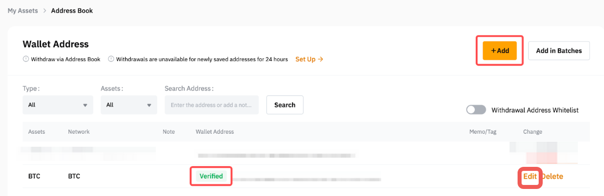 Schritt 2: Bitte klicken Sie auf Hinzufügen in der oberen rechten Ecke der Seite, um eine neue Wallet-Adresse hinzuzufügen, oder wählen Sie die Wallet-Adresse aus, die Sie überprüfen möchten, indem Sie auf Bearbeiten.