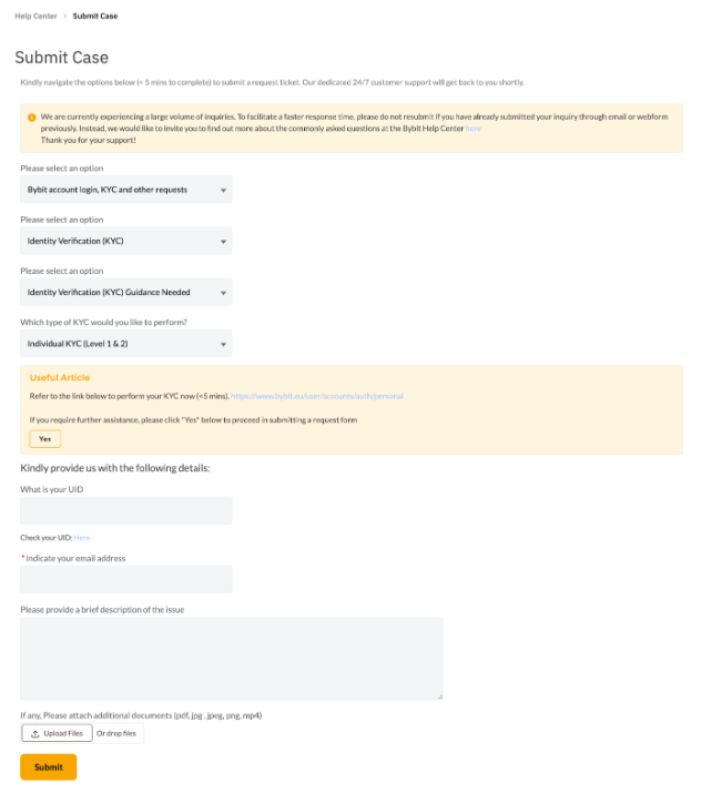 Schritt 1: Besuchen Sie die Bybit EU Hilfecenter und klicken Sie auf Fall Einreichen.