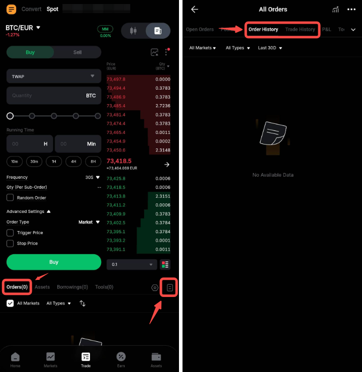 Um deine Orderdetails oder deine Handelshistorie einzusehen, gehe im Positionsbereich zu Offene Aufträge, Auftragshistorie oder Handelshistorie.