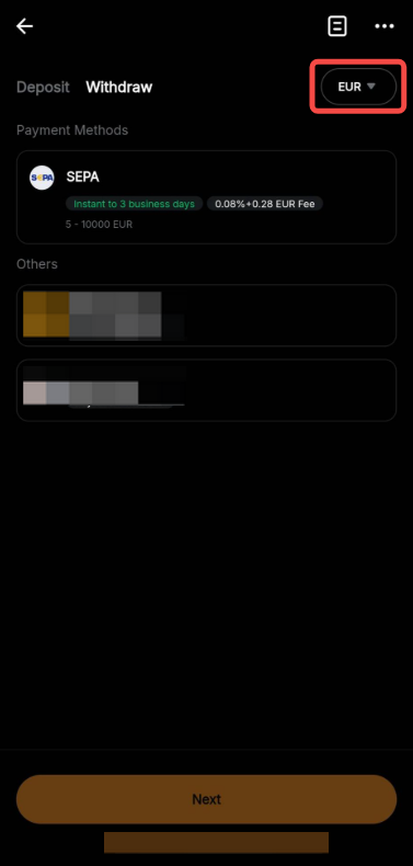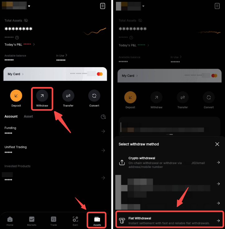Um deine Fiatwährung auszuzahlen, gehe zur Assets-Seite und tippe auf Transfer → Fiat Withdrawal. Die Abläufe für Auszahlungen unterscheiden sich je nach Fiatwährung leicht. Weitere Details findest du in diesem Leitfaden.