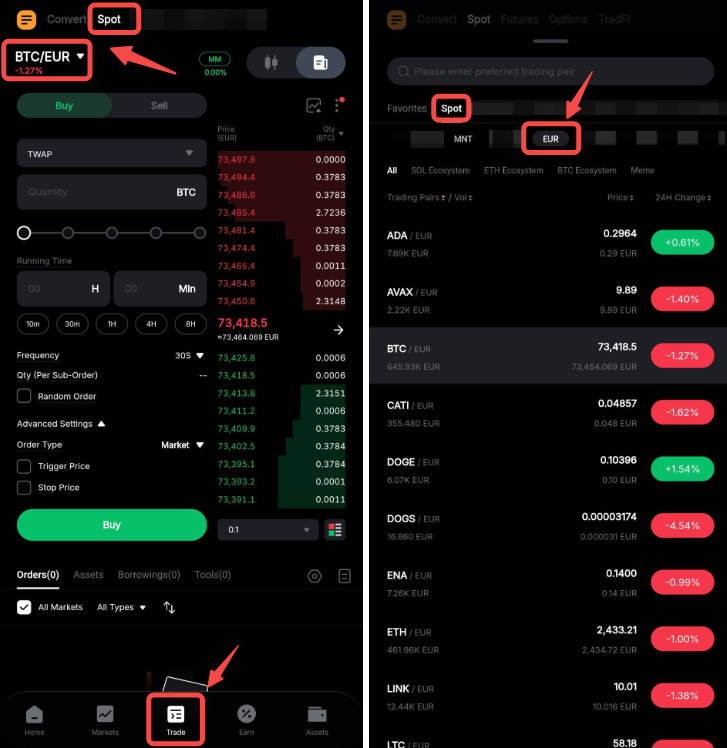 Klicke in der Navigationsleiste auf Trade → Spot und wähle anschließend das entsprechende Fiat-Handelspaar aus, um deine Transaktion zu starten.