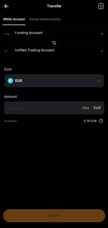 Deine Fiat-Einzahlung wird deinem Funding Account gutgeschrieben. Bevor du eine Order platzierst, musst du die Fiatwährung vom Funding Account auf deinen Unified Trading Account übertragen.