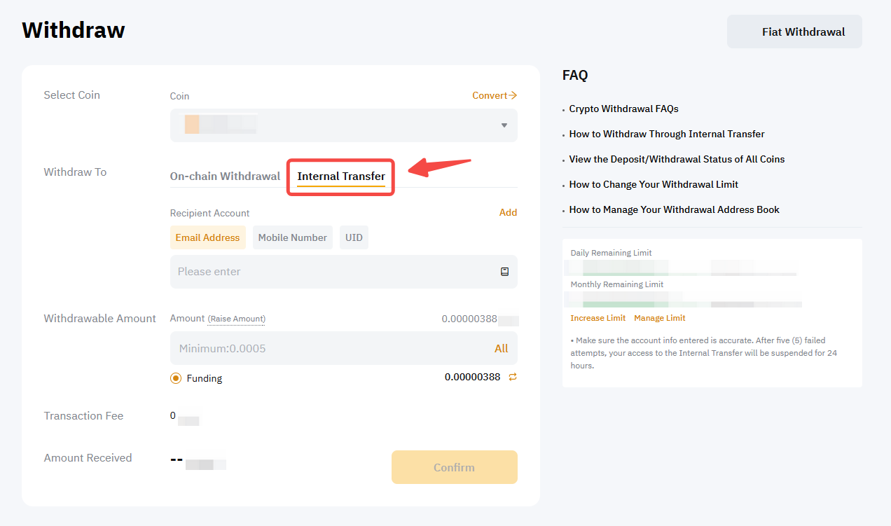 Bybit EU führt eine Auszahlungsmethode Interne Überweisung ein, mit der Benutzer Vermögenswerte sofort und ohne Auszahlungsgebühr auf andere Bybit EU-Konten abheben können. Wenn Sie Ihr Vermögen auf eine andere Börse oder in ein anderes Wallet abheben möchten, müssen Sie Ihr Vermögen per On-Chain-Abhebung abheben. Einzelheiten finden Sie unter So reichen Sie einen On-Chain Auszahlungsanfrage ein.