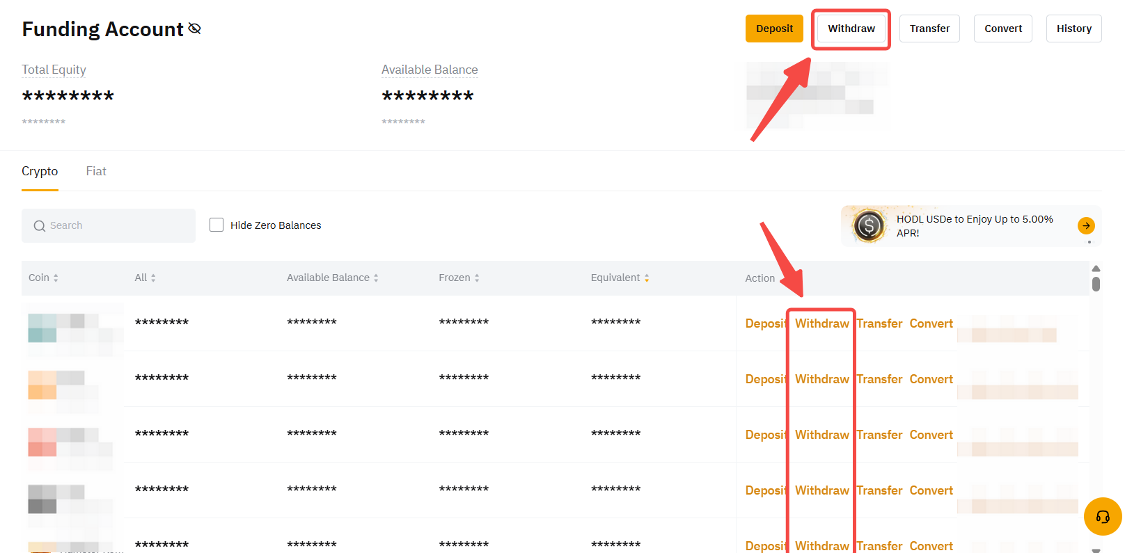 Schritt 2: Klicken Sie auf Auszahlen in der Spalte der Währung, die Sie abheben möchten.