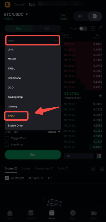 Schritt 1: ippe unten in der Bybit EU App auf Handel, um die entsprechende Handelsseite zu öffnen. Stelle dann die Auftragsart auf TWAP um.