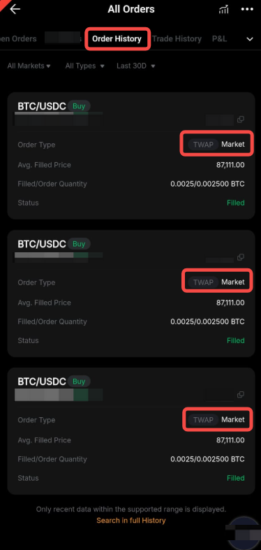 Auch hier kannst du TWAP-Aufträge an ihrem TWAP-Label erkennen.