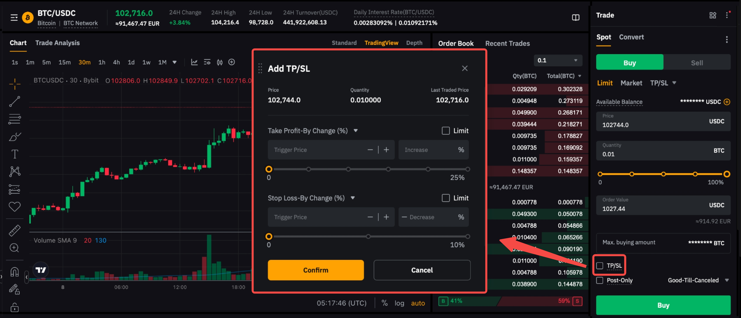 — For the TP/SL sell order attached to your Spot Limit buy order, the TP trigger price has to be higher than your Limit order price, while the SL trigger price has to be lower than your Limit order price.