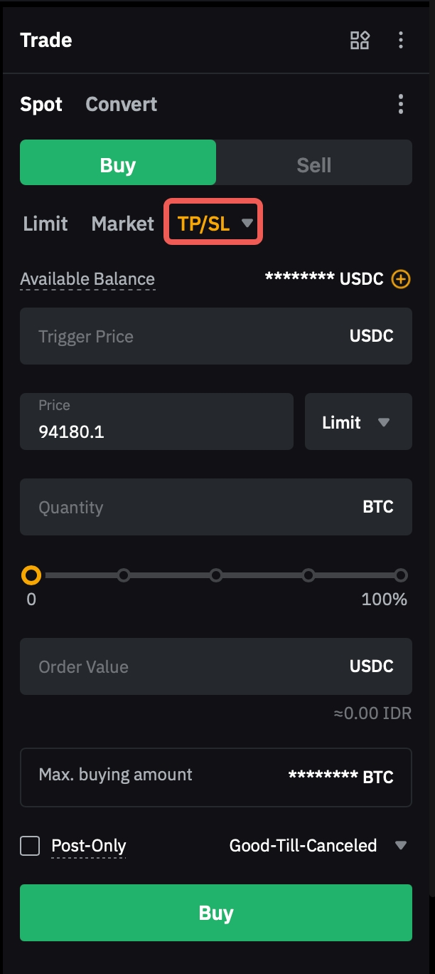 You can set the trigger price, order price (Limit order), and order quantity to the TP/SL order. The assets will be occupied at the time when the TP/SL order is placed. Once the last traded price reaches the preset trigger price, a Limit or Market order will be placed according to the present order parameters.