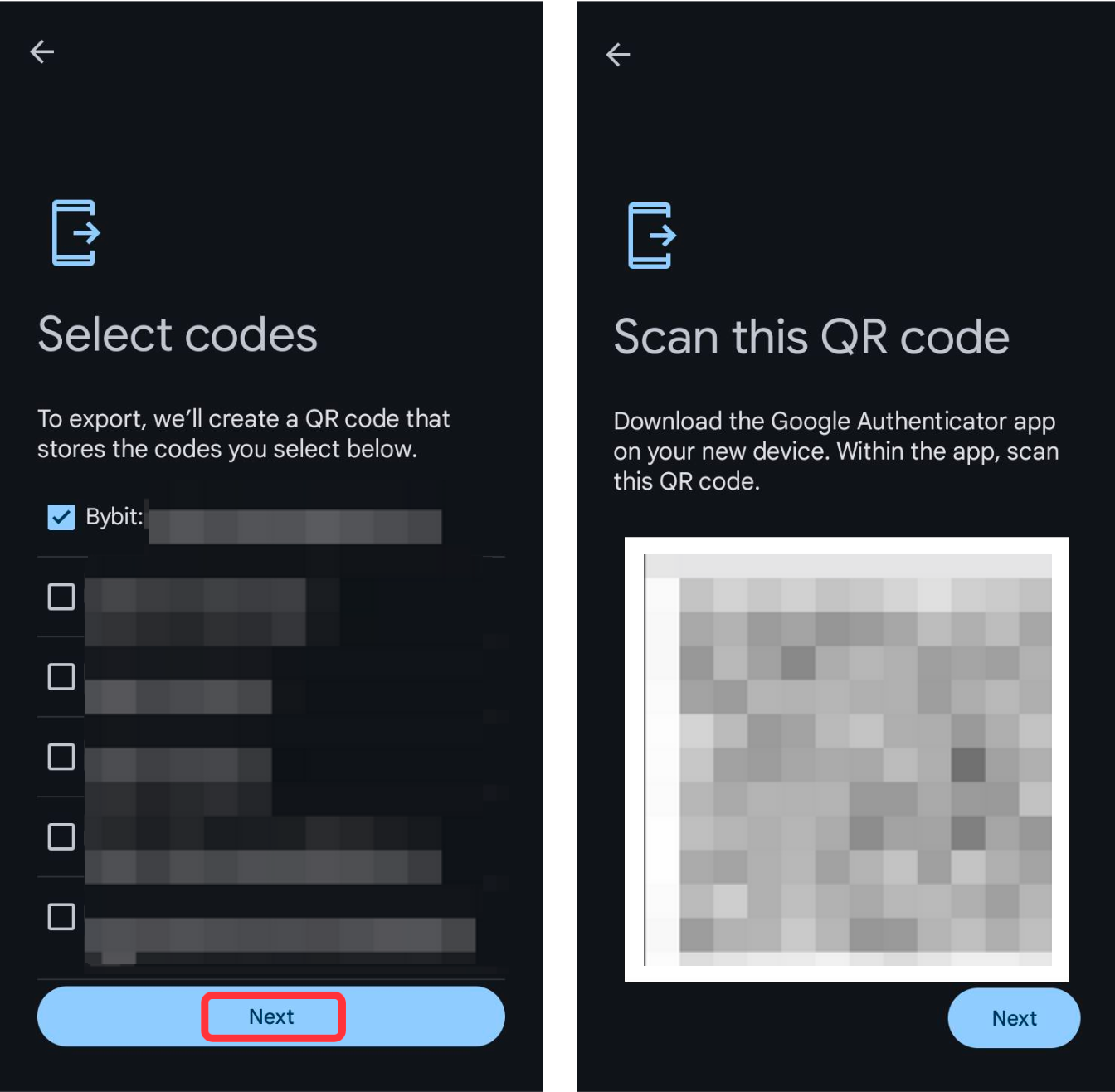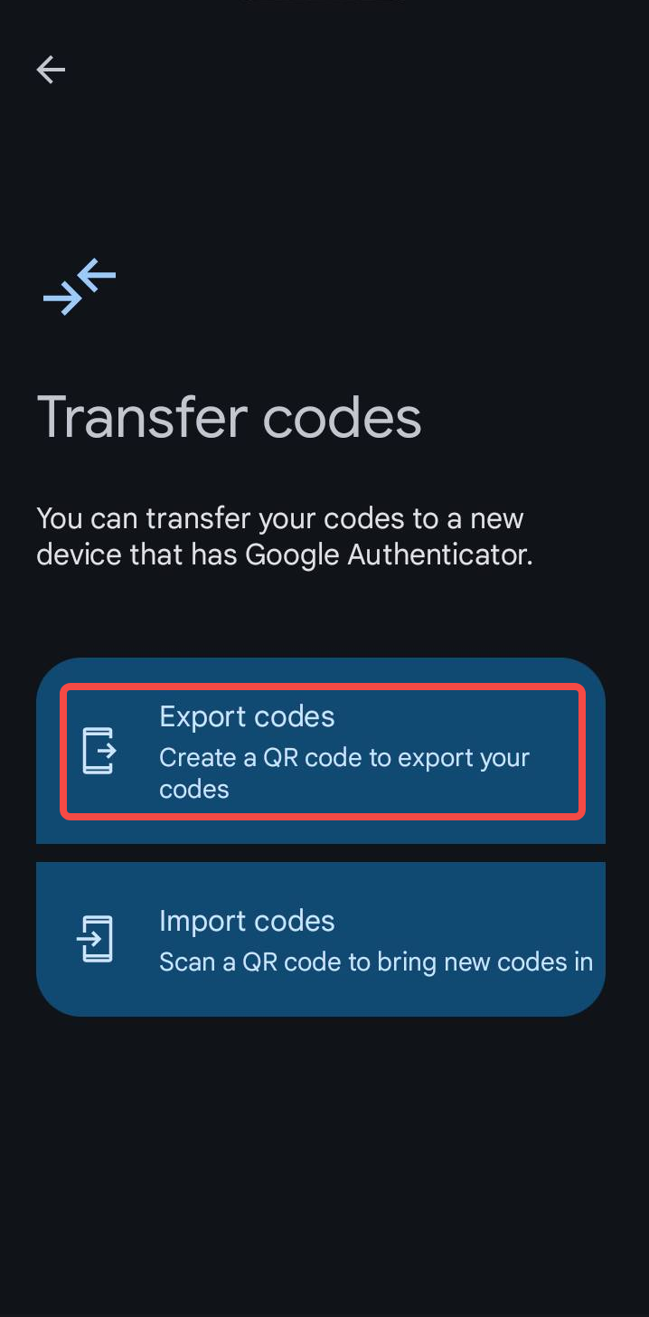 Tippen Sie auf das Exportcodes und wählen Sie dann ein Konto aus, um den Code per QR-Scan auf ein neues Gerät zu übertragen.